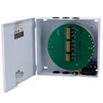 Caja de distribución de alimentación AC24V8A-PD8 de 24V y 192W con sistema de protección por fusibles, diseñada para instalaciones profesionales de seguridad, detección de incendios y videovigilancia. Permite alimentar hasta 8 dispositivos de forma independiente con protección individual por circuito.