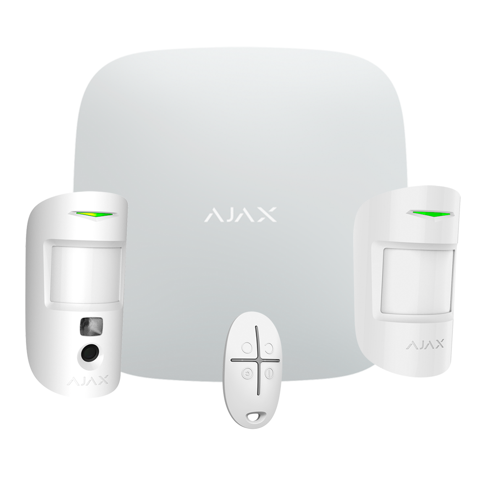 - Kit formado por: AJ-HUB2-W (panel con batería de respaldo), 1 detector de movimiento PIR con cámara AJ-MOTIONCAM-W, 1 detector de movimiento PIR AJ-MOTIONPROTECT-W y 1 control remoto AJ-SPACECONTROL-W