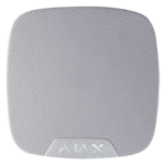 Sirena interior Ajax HomeSiren AJ-HOMESIREN-W con certificación Grado 2 según EN 50131-6, comunicación inalámbrica Jeweller bidireccional y alimentación cableada. Emite 105 dB de potencia sonora con señalización luminosa LED para notificación de alarmas en sistemas de seguridad antiintrusión profesionales.