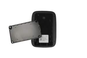 La carcasa cuenta con grado de protección IP54 para instalaciones en entornos semiexteriores como porches cubiertos, garajes o accesos protegidos de la intemperie directa. El montaje se realiza mediante tornillos de seguridad y soporte SmartBracket que permite ajuste angular para optimizar la ergonomía de uso según la altura de instalación.