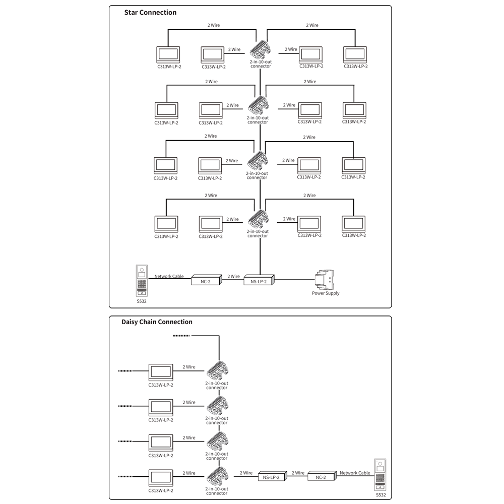 Los equipos de 2 hilos se comunican y alimentan mediante cables de cobre convencionales (llamados hilos) y distribuidores, permitiendo reutilizar las instalaciones convencionales que ya cuentan con este tipo de cableado.