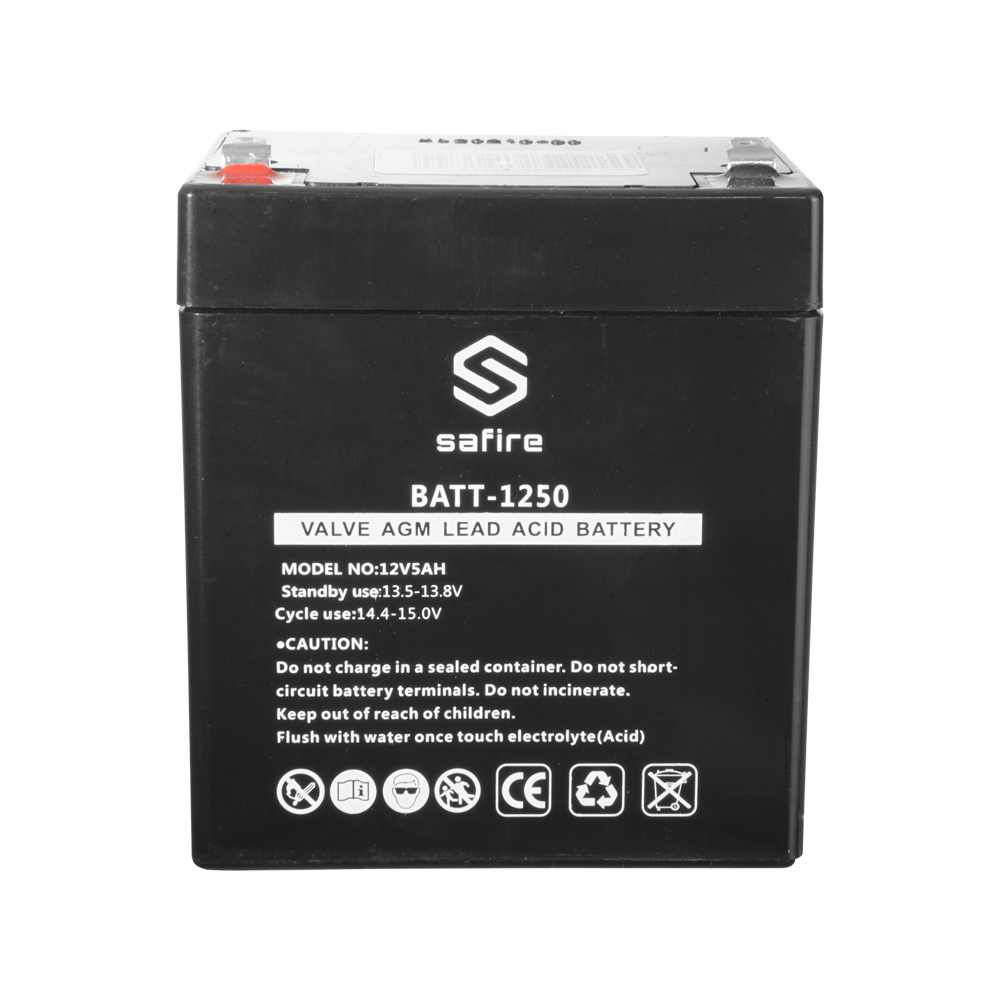 Batería recargable BATT-1250 con tecnología plomo ácido AGM de 12V y capacidad de 5.0 Ah, diseñada específicamente para sistemas de respaldo en centrales de detección de incendios. Dimensiones compactas de 105 x 90 x 70 mm y peso de 1630 gramos, garantizando alimentación continua y fiable en instalaciones de protección contra incendios según normativa vigente.