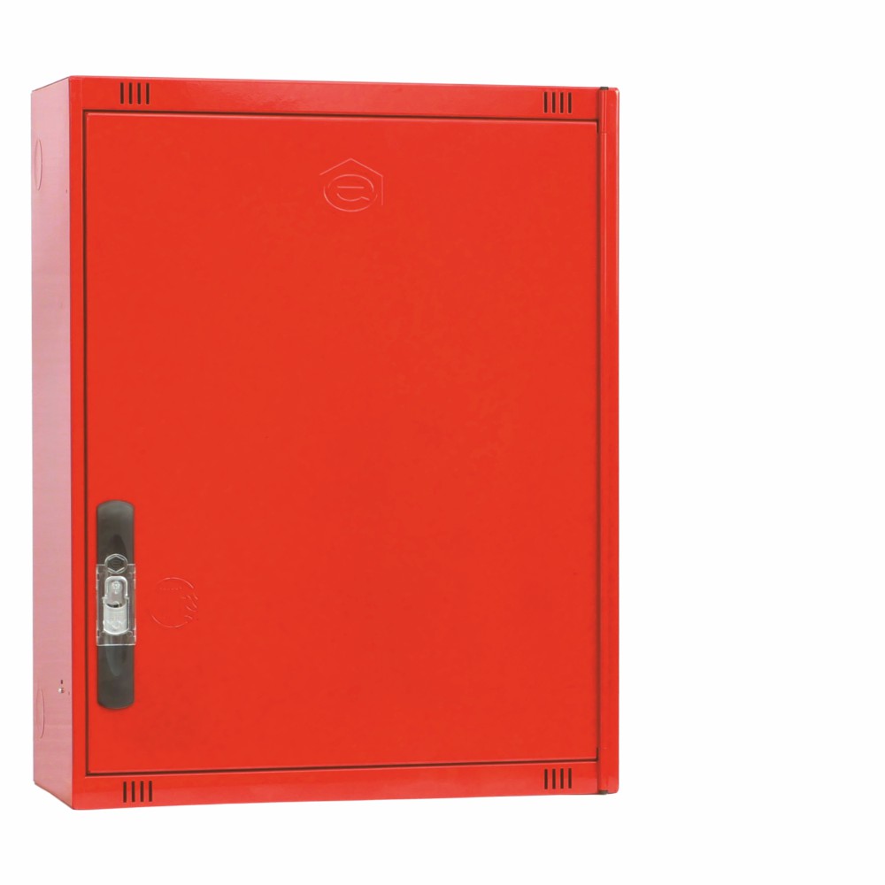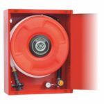 Las dimensiones del armario BIE EACI 530C son: altura 685 mm, anchura 530 mm y fondo 260 mm, configuración vertical optimizada para instalación en pasillos y zonas de evacuación. El armario está fabricado en chapa de acero de alta resistencia con tratamiento anticorrosión y acabado en pintura poliéster termoendurecida RAL 3000, garantizando una durabilidad excepcional incluso en ambientes exigentes. La devanadera fabricada en termoplástico copolímero ofrece ventajas significativas frente a las tradicionales de chapa metálica: ausencia de abolladuras y deformaciones, sin deterioro de pintura, resistencia total a la oxidación, mayor resistencia al impacto y peso reducido para facilitar la manipulación durante las operaciones de extinción.
