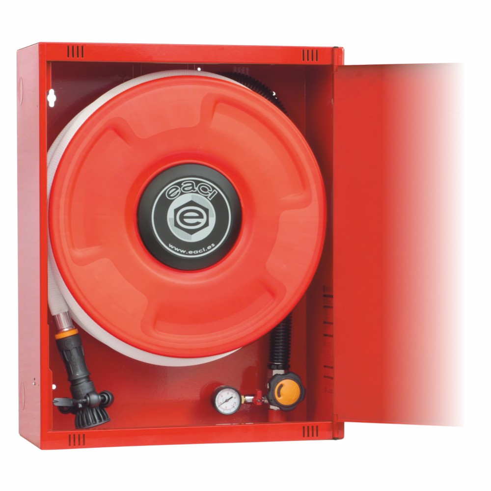 Boca de Incendio Equipada BIE 25mm modelo EACI 530C con armario vertical de puerta ciega y manguera semirrígida de 20 metros. Equipo certificado conforme a UNE-EN 671-1 con sistema exclusivo Eacisystem para mantenimiento simplificado. Instalación obligatoria según RIPCI (RD 513/2017) en edificios administrativos, comerciales, hospitalarios y de pública concurrencia.