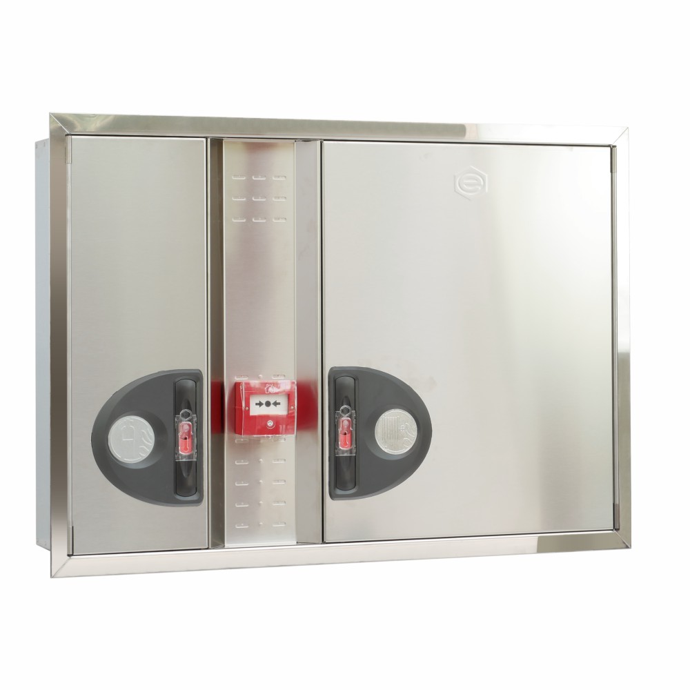 La BIE 25mm EACI COMPAC 3i representa la solución premium de boca de incendio equipada para instalaciones que demandan máxima funcionalidad y estética impecable. Este equipo de protección contra incendios combina un innovador sistema de armario de dos cuerpos independientes con acabados en Acero Inoxidable AISI 304, posicionándose como la elección preferente para hoteles de lujo, edificios corporativos, centros comerciales y hospitales donde la integración visual es prioritaria. El diseño horizontal con frontal extraíble y panel reversible para módulo técnico ofrece versatilidad total en la instalación, mientras que el compartimento dedicado para extintor centraliza los medios de extinción en un único punto estratégico.