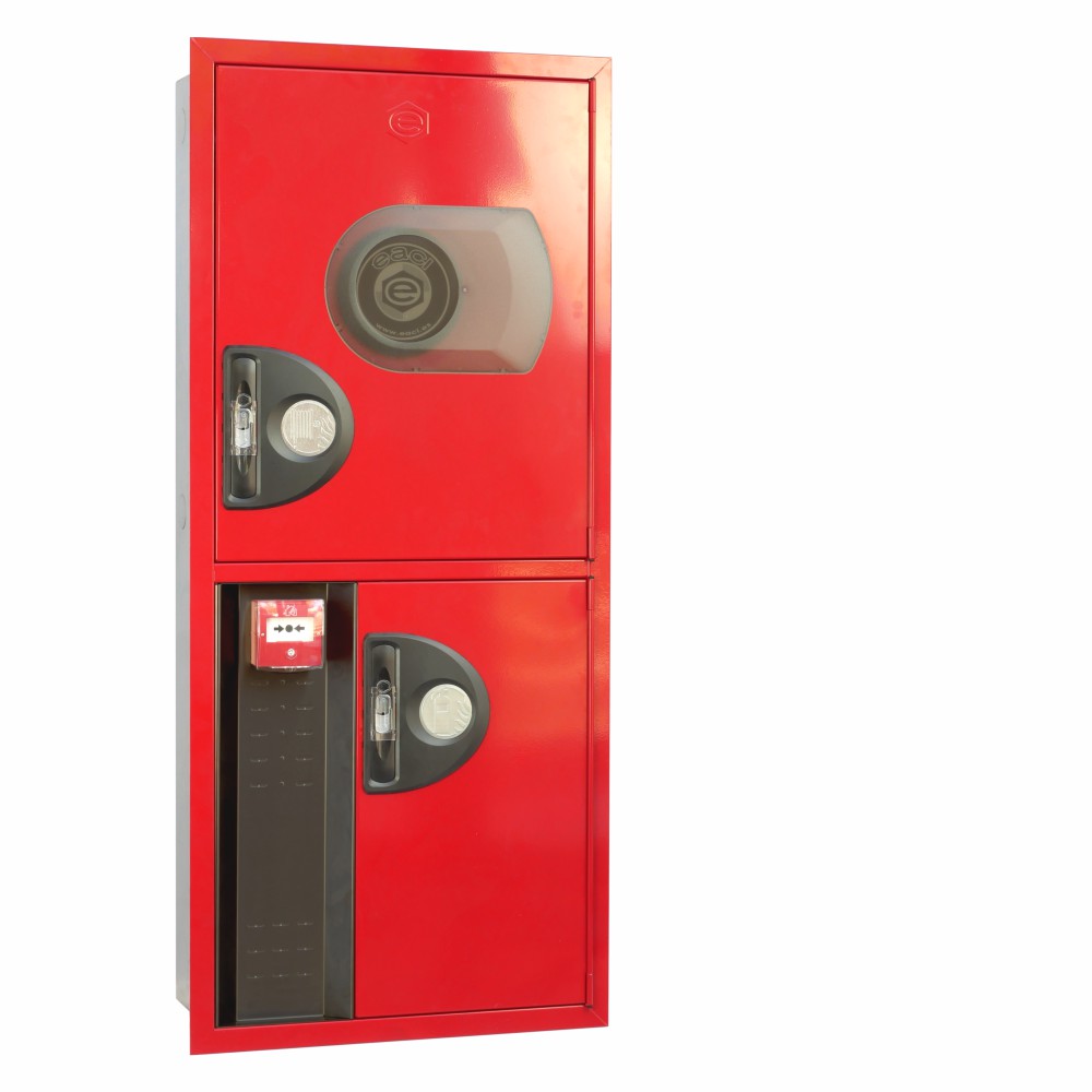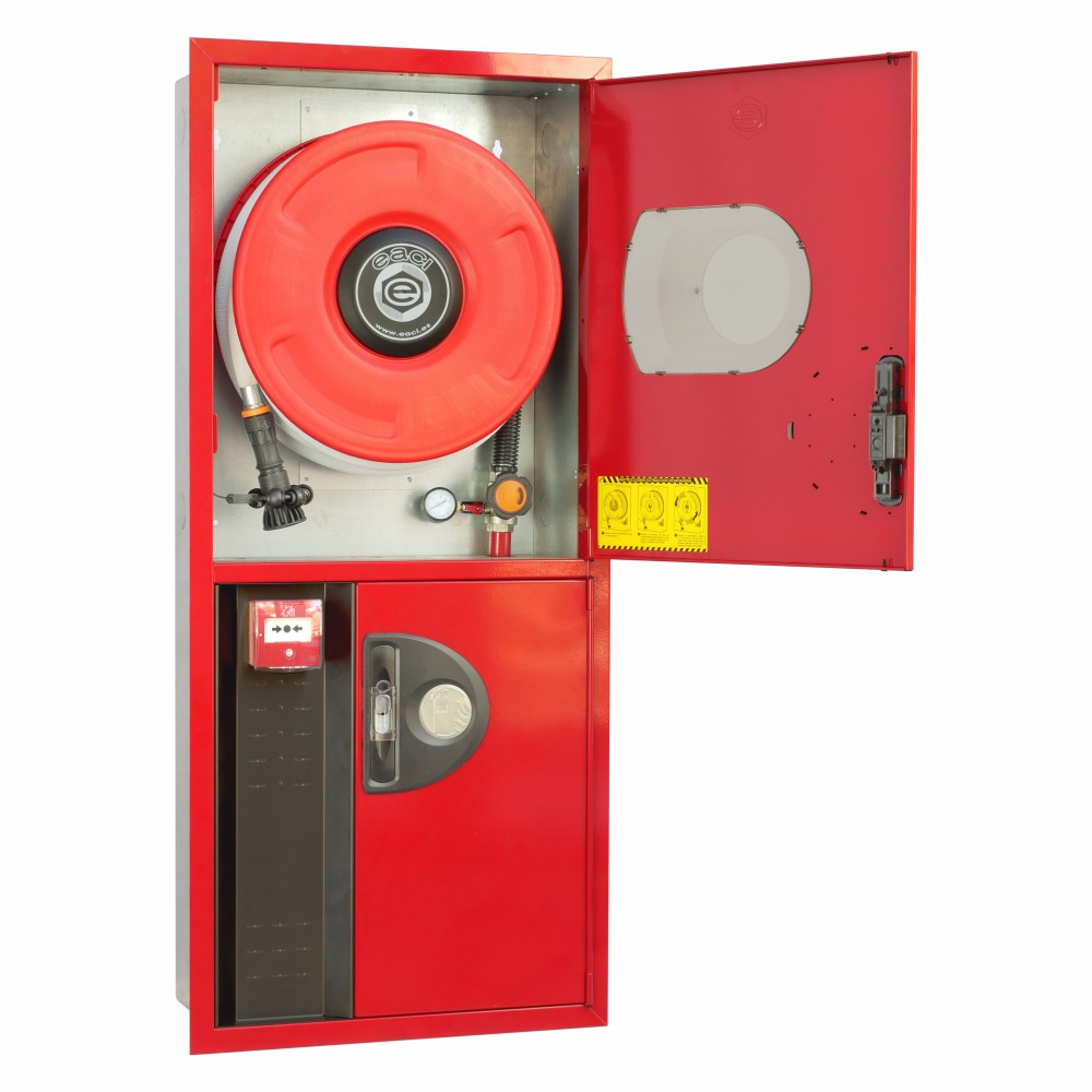 Boca de incendio equipada BIE 25mm EACI COMPAC 3RV con frontal extraíble y puerta con visor. Armario vertical de dos cuerpos con departamento para extintor y panel reversible. Equipada con manguera semirrígida de 20 metros y devanadera de termoplástico copolímero. Certificada según UNE-EN 671-1, ideal para edificios administrativos, comerciales, hoteles, hospitales y aparcamientos que requieren integración estética y funcionalidad máxima.