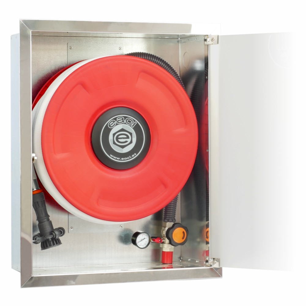 Boca de incendio equipada BIE 25mm EACI modelo COMPAC iM para empotrar, con frontal extraíble en acero inoxidable AISI 304 brillo y puerta de metacrilato translúcido. Equipada con manguera semirrígida de 20 metros conforme a UNE-EN 671-1. Diseño premium para zonas nobles en edificios administrativos, hoteles, hospitales y centros comerciales que exigen máxima estética y funcionalidad.