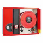 Las dimensiones del cajón de empotramiento son Altura 700 mm, Ancho 995 mm y Fondo 243 mm, mientras que el frontal extraíble mide Altura 760 mm y Ancho 1055 mm. El armario está fabricado en chapa de acero galvanizado para el cajón interior, garantizando protección anticorrosión duradera. Las puertas y el marco tapajuntas están acabados en pintura poliéster RAL 3000 rojo bombero de serie, con opción de RAL 9010 blanco bajo pedido. La devanadera termoplástica ofrece resistencia UV certificada según ISO 4892-2 mediante exposición a fuentes luminosas de arco de Xenón. El sistema incorpora válvula de bola de 1 pulgada en latón cromado de alta calidad, manómetro con escala hasta 16 bar y válvula de corte independiente para facilitar las revisiones periódicas. La manguera semirrígida de 25 mm cumple la norma EN-694 con 20 metros de longitud estándar. La configuración con toma adicional 45mm incluye válvula de asiento en latón cromado con cierre vulcanizado, racor Barcelona certificado AENOR según UNE 23400 y tapón Barcelona DN 45 mm igualmente certificado.