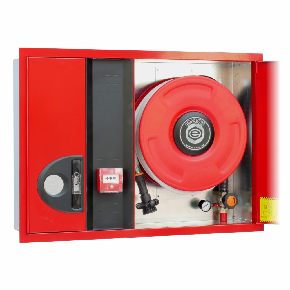 Boca de incendio equipada BIE 25mm EACI COMPAC 3 con armario horizontal empotrable, compartimento para extintor y panel reversible para módulo técnico. Fabricada según UNE-EN 671-1 con 20 metros de manguera semirrígida. Solución integral certificada para edificios administrativos, comerciales, industriales, hoteles, hospitales y aparcamientos que requieren protección contra incendios centralizada.