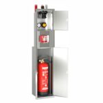 Boca de incendio equipada BIE 25mm EACI modelo ENOX 3LS con armario de empotramiento en acero inoxidable AISI 304. Configuración vertical con departamento para extintor y módulo técnico de alarma. Fabricada según UNE-EN 671-1 y homologada para cumplimiento del RIPCI RD 513/2017. Ideal para zonas nobles de edificios administrativos, hoteles, hospitales y centros comerciales.
