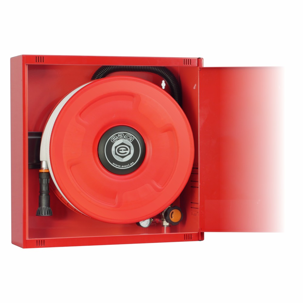 Boca de incendio equipada BIE 25mm modelo EACI F200 con armario horizontal pivotante y manguera semirrígida de 20 metros. Fabricada según UNE-EN 671-1 con sistema exclusivo Eacisystem para mantenimiento sin vaciar la instalación. Diseñada para edificios administrativos, comerciales, hoteles, hospitales y aparcamientos conforme al CTE DB-SI y RIPCI RD 513/2017.