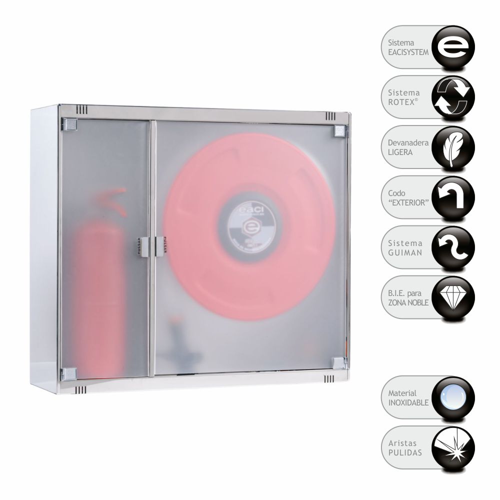 Boca de incendio equipada BIE 25mm EACI MASTER 2PEI de gama alta en acero inoxidable AISI 304 con departamento para extintor integrado. Armario horizontal con puertas de metacrilato translúcido, ideal para zonas nobles que requieren estética cuidada. Certificada según UNE-EN 671-1 y conforme al RIPCI RD 513/2017. Incluye 20 metros de manguera semirrígida y sistemas exclusivos EACI: ROTEX, Eacisystem y Guiman.