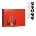 La BIE EACI MASTER 3C presenta unas dimensiones de 710 x 940 x 245 mm (alto x ancho x fondo), diseñadas específicamente para alojar el equipo de BIE junto con un extintor portátil y los elementos del módulo técnico de detección. El armario está fabricado en chapa de acero de alta resistencia con acabado en pintura de poliéster color rojo RAL 3000, garantizando máxima visibilidad según normativa y protección anticorrosiva de larga duración. Las puertas ciegas encastradas incorporan cerraduras de resbalón fabricadas en termoplástico de alta resistencia, junto con precintos de seguridad numerados que evidencian cualquier manipulación no autorizada y llave de cortesía para operaciones de mantenimiento.