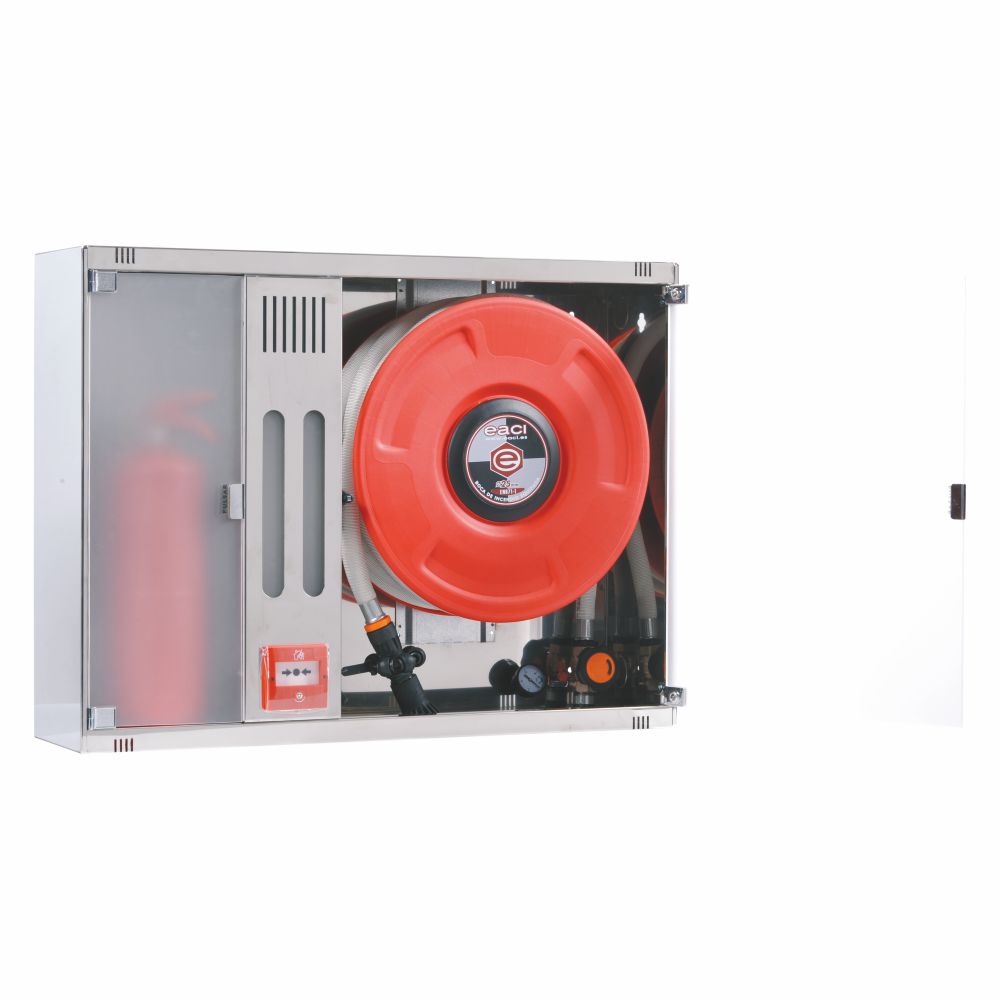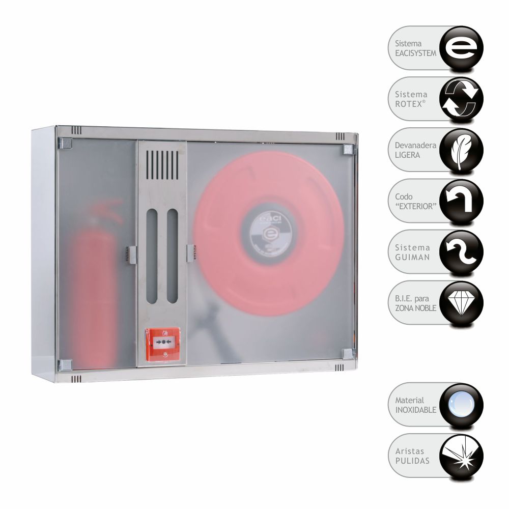 Boca de incendio equipada BIE 25mm EACI MASTER 3PEI con armario horizontal en acero inoxidable AISI 304 y compartimento integrado para extintor. Incluye manguera semirrígida de 20 metros conforme a UNE-EN 671-1 y módulo técnico para elementos de detección. Solución premium de EACI para zonas nobles que requieren máxima estética y funcionalidad en protección contra incendios.
