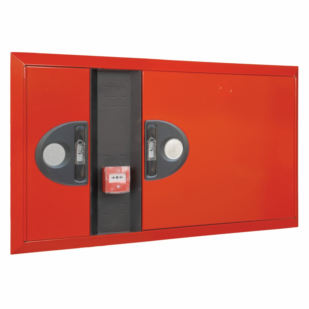 El armario NARROW 3 está formado por 2 cuerpos independientes: cajón de empotramiento y frontal extraíble con marco biselado. El cajón de empotramiento presenta dimensiones de 610 mm de altura, 1105 mm de ancho y 160 mm de fondo, fabricado en chapa de acero galvanizado sin pintar para máxima resistencia a la corrosión en instalaciones empotradas. El frontal extraíble mide 695 mm de altura, 1190 mm de ancho y 30 mm de fondo, acabado en pintura Poliéster RAL 3000 (rojo normalizado para equipos contra incendios). Las puertas ciegas comparten el mismo acabado RAL 3000, proporcionando una estética uniforme y profesional. La configuración horizontal optimiza la instalación en pasillos donde la altura disponible es limitada, mientras que el sistema de 2 cuerpos independientes facilita enormemente el proceso de instalación y posteriores labores de mantenimiento.