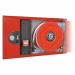 El sistema ROTEX patentado revoluciona la instalación de BIEs al permitir conectar la alimentación de agua desde cualquier orientación sin necesidad de codos ni piezas complementarias. Con 8 posibles entradas de alimentación, el instalador dispone de total flexibilidad para adaptar el equipo a la configuración de la red de agua existente. El sistema Eacisystem ha sido diseñado pensando en el mantenimiento preventivo: retirando un simple pasador, la devanadera se extrae completamente del armario, permitiendo acceder a juntas y componentes internos sin necesidad de vaciar la instalación de agua. Esta característica reduce drásticamente el tiempo y coste de las revisiones periódicas obligatorias. El sistema Guiman con rolinas de geometría totalmente esférica fabricadas en Poliamida garantiza un deslizamiento perfecto de la manguera en cualquier dirección, eliminando atascos y facilitando el despliegue rápido en caso de emergencia.