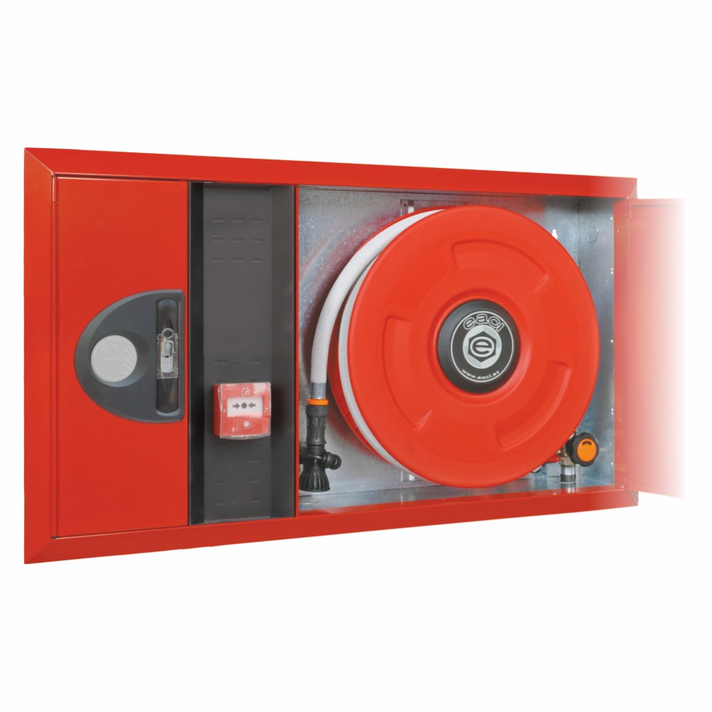 Boca de incendio equipada BIE 25mm EACI NARROW 3 con configuración horizontal reversible, departamento para extintor y registro para módulo técnico. Armario de 2 cuerpos independientes con manguera semirrígida de 20 metros conforme a UNE-EN 671-1. Solución integral certificada para edificios administrativos, comerciales, hospitalarios y aparcamientos según CTE DB-SI y RIPCI.