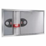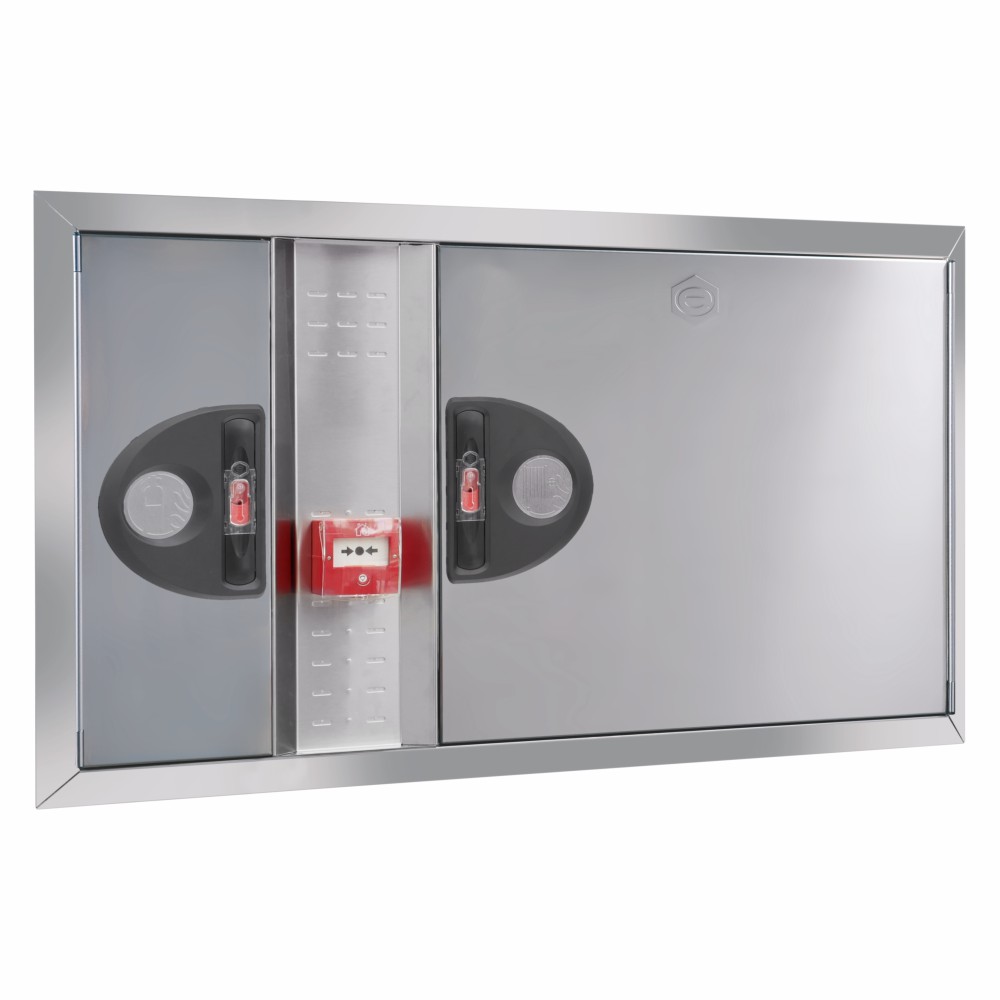Boca de incendio equipada BIE 25mm EACI NARROW 3i con frontal extraíble en acero inoxidable AISI 304, departamento integrado para extintor y módulo técnico de detección. Configuración horizontal reversible con manguera semirrígida de 20 metros certificada según UNE-EN 671-1. Solución premium para edificios administrativos, hoteles, hospitales y espacios que exigen máxima estética y funcionalidad.