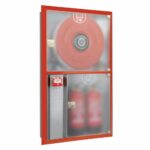 Boca de incendio equipada BIE 25mm EACI NARROW 3VM con configuración vertical, armario empotrado para extintor y registro de módulo técnico. Equipo completo con manguera semirrígida de 20 metros certificado según UNE-EN 671-1. Diseñada para zonas nobles con frontal extraíble en metacrilato translúcido y acabado RAL 3000.