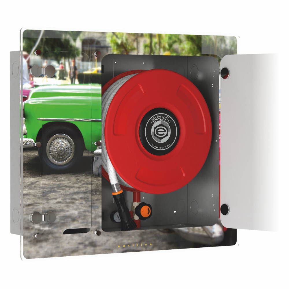 La BIE EACILINE 2 presenta unas dimensiones de cajón de empotrar de 700 x 810 x 243mm (Alto x Ancho x Fondo) con un frontal decorativo de 860 x 970mm. El panel frontal está fabricado en metacrilato de alta calidad de 8mm de espesor, material que garantiza transparencia, resistencia al impacto y durabilidad en el tiempo. Las bisagras de latón cromado permiten una apertura de 180º para facilitar el acceso completo al equipo en caso de emergencia. El sistema de cierre mediante imanes asegura el correcto posicionamiento de las puertas sin elementos metálicos visibles que rompan la estética del conjunto. La devanadera en termoplástico copolímero ofrece resistencia UV certificada según ISO 4892-2, eliminando problemas de oxidación, abolladuras y deterioro de pintura presentes en las devanaderas metálicas tradicionales.