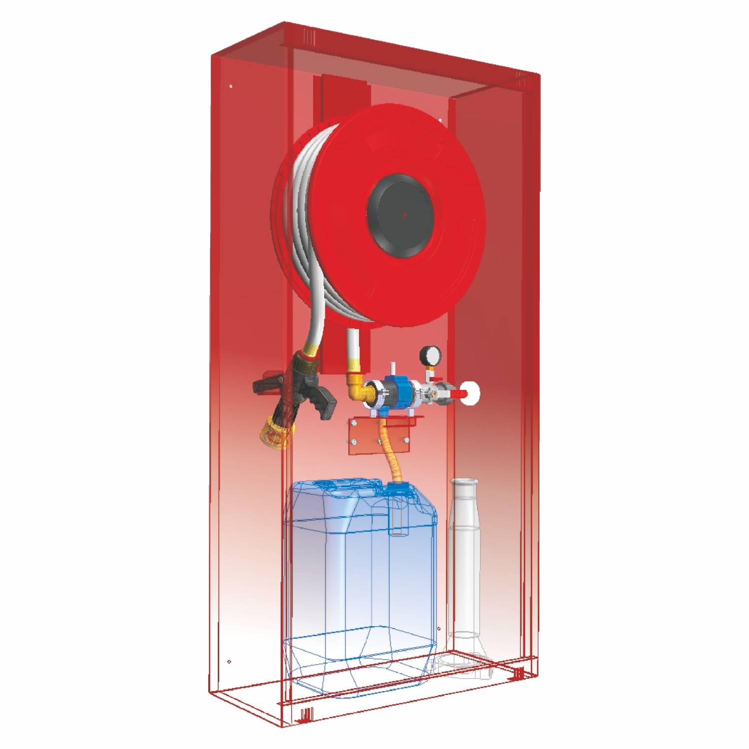 La boca de incendio equipada con espumógeno integrado combina en un único armario todos los elementos necesarios para la extinción mediante espuma: carrete con manguera, depósito de concentrado, proporcionador y lanza generadora. Esta configuración permite una respuesta inmediata ante fuegos clase B sin necesidad de equipos auxiliares ni instalaciones complementarias.
