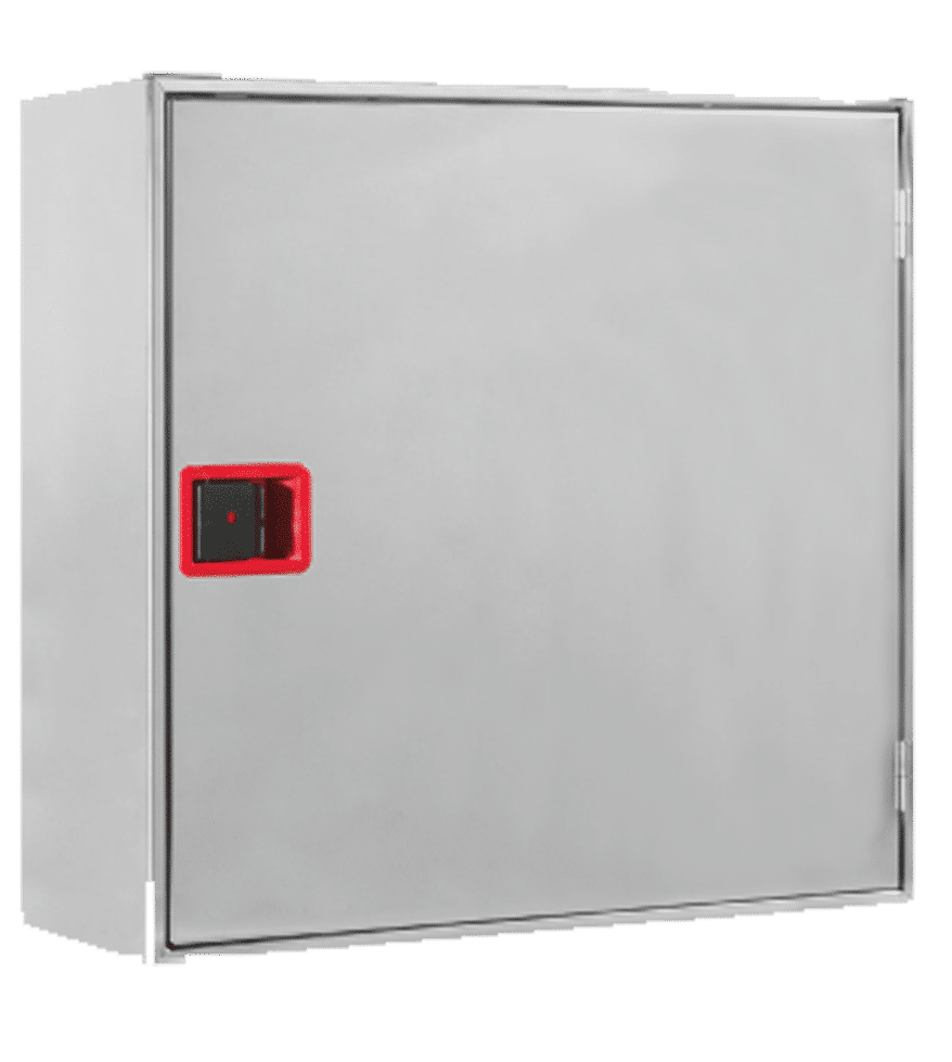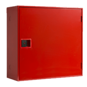 Está compuesta por armario horizontal construido en chapa de acero de 1 mm de espesor, pintado en color rojo RAL 3000, de medidas 630 x 610 x 245 mm, con puerta semiciega para metacrilato, y cerradura de apertura fácil, provisto de soporte de fijación del brazo y pretaladros para la entrada de alimentación, incluyendo devanadera, manguera, lanza, brazo abatible, válvula de asiento, manómetro y latiguilo de alimentación.