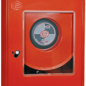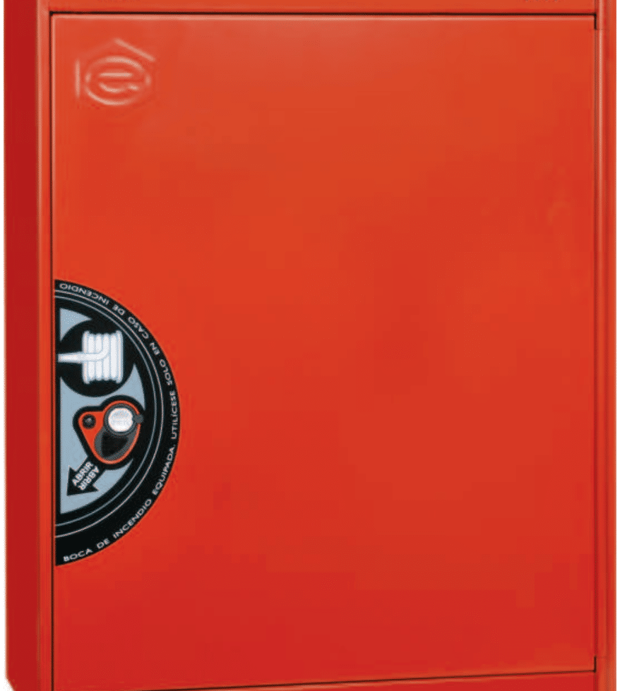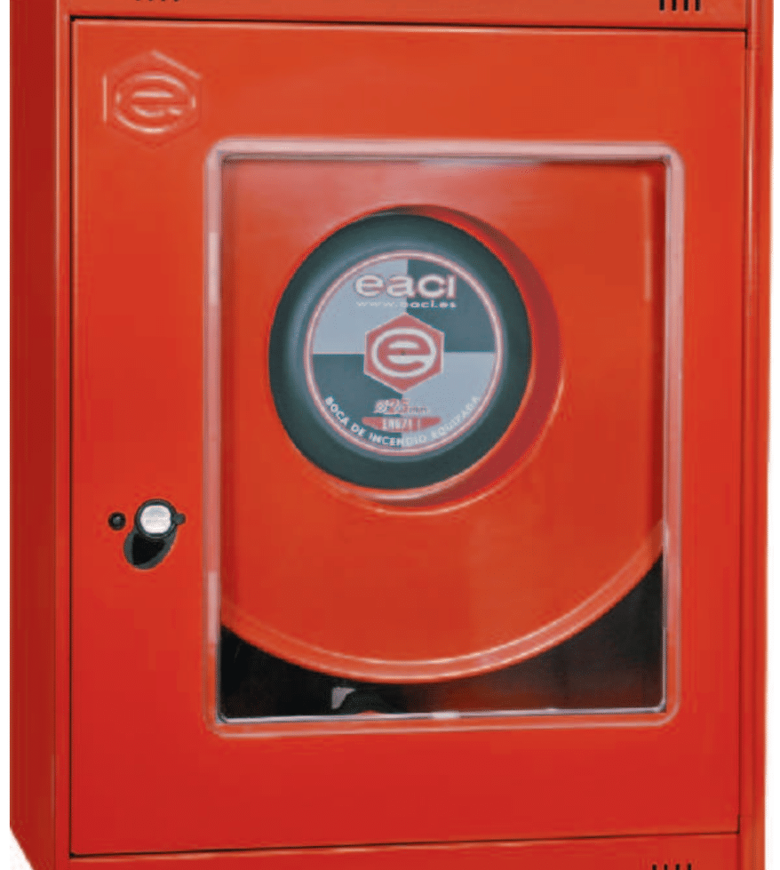 Boca de incendio equipada de 25 mm en armario vertical de chapa de acero, con devanadera fija, alimentación axial y componentes preparados para una instalación robusta y funcional.