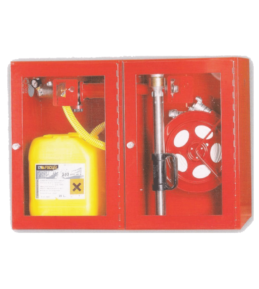 | Armario | 1000 x 700 x 230 mm. Doble armario con dosificador y depósito de 20 litros de espumógeno, y manguera con lanza de baja expansión. Puerta metacrilato y armario rojo RAL 9010. |