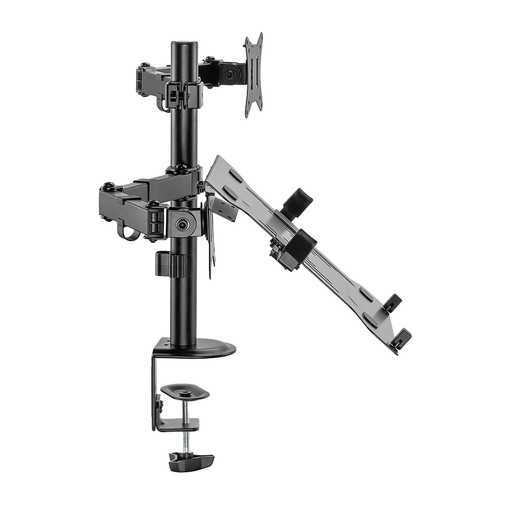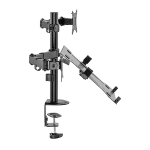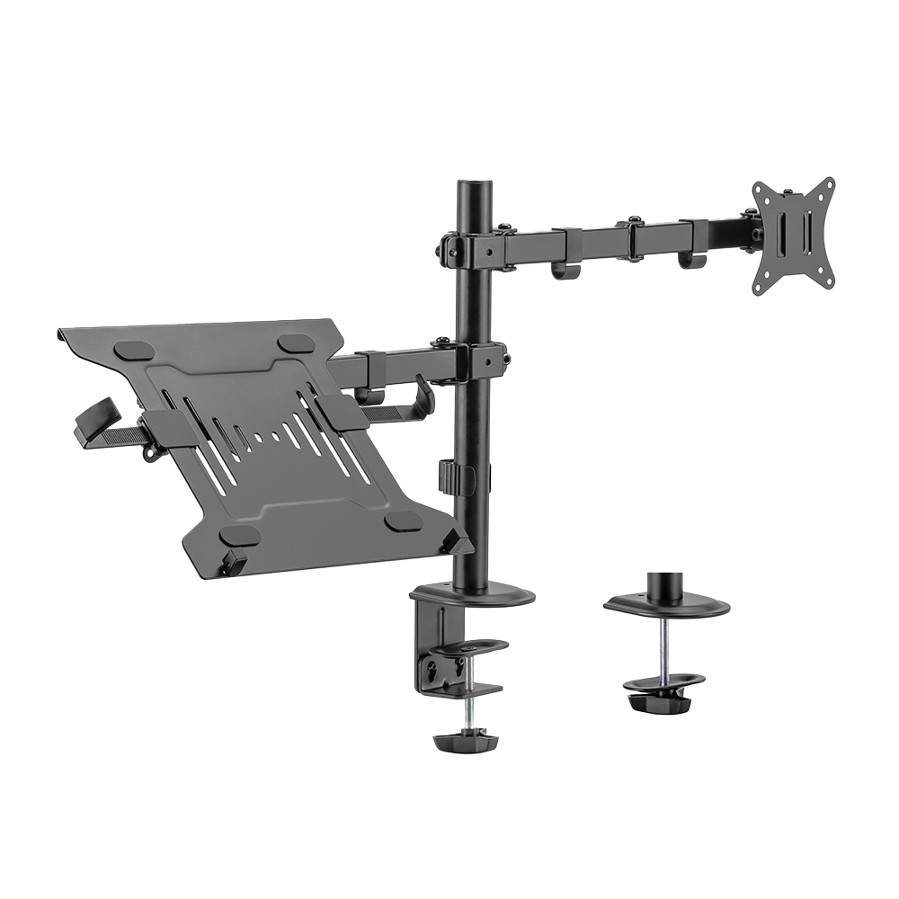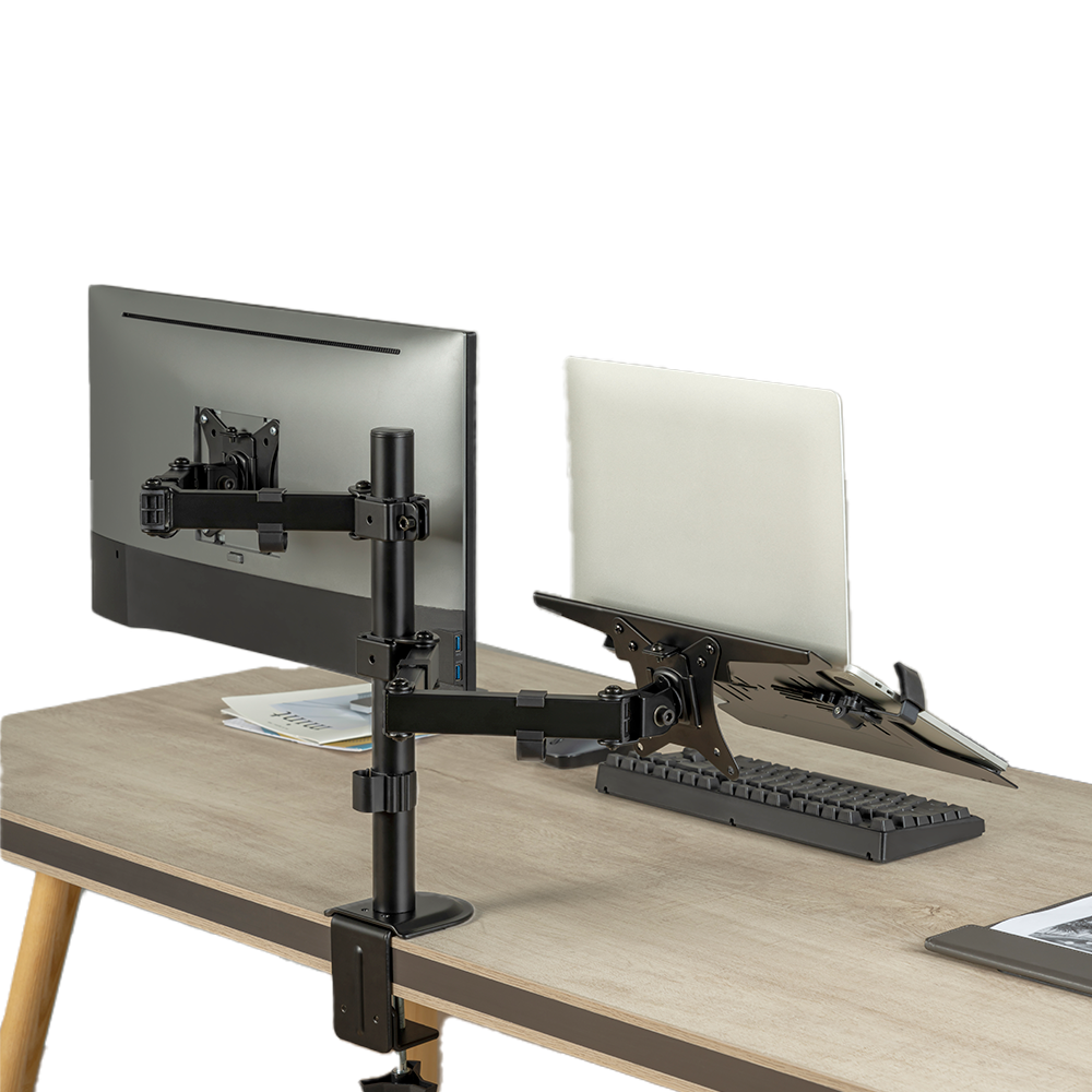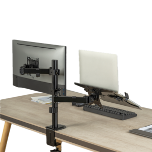 Un soporte de brazo de mesa para monitor es un accesorio diseñado para sostener y ajustar el monitor de forma ergonómica. Se fija al borde o a la superficie del escritorio mediante una base o abrazadera, y permite mover el monitor con libertad en diferentes direcciones: altura, inclinación, giro y distancia.