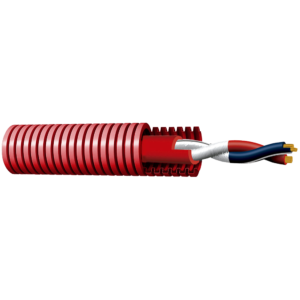 Cable trenzado apantallado resistente al fuego RF 120 minutos, especialmente diseñado para sistemas de detección de incendios. Conductor de cobre 2×1.5mm² en bobina de 100 metros, precableado en tubo corrugado y certificado CPR Cca según EN 50575.