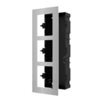 Caja de registro empotrada DS-KD-ACF3/S diseñada específicamente para la instalación profesional de videoporteros modulares Hikvision de 3 módulos. Facilita el montaje flush en pared, protegiendo el cableado y proporcionando un acabado estético en instalaciones de control de accesos residenciales y comerciales.