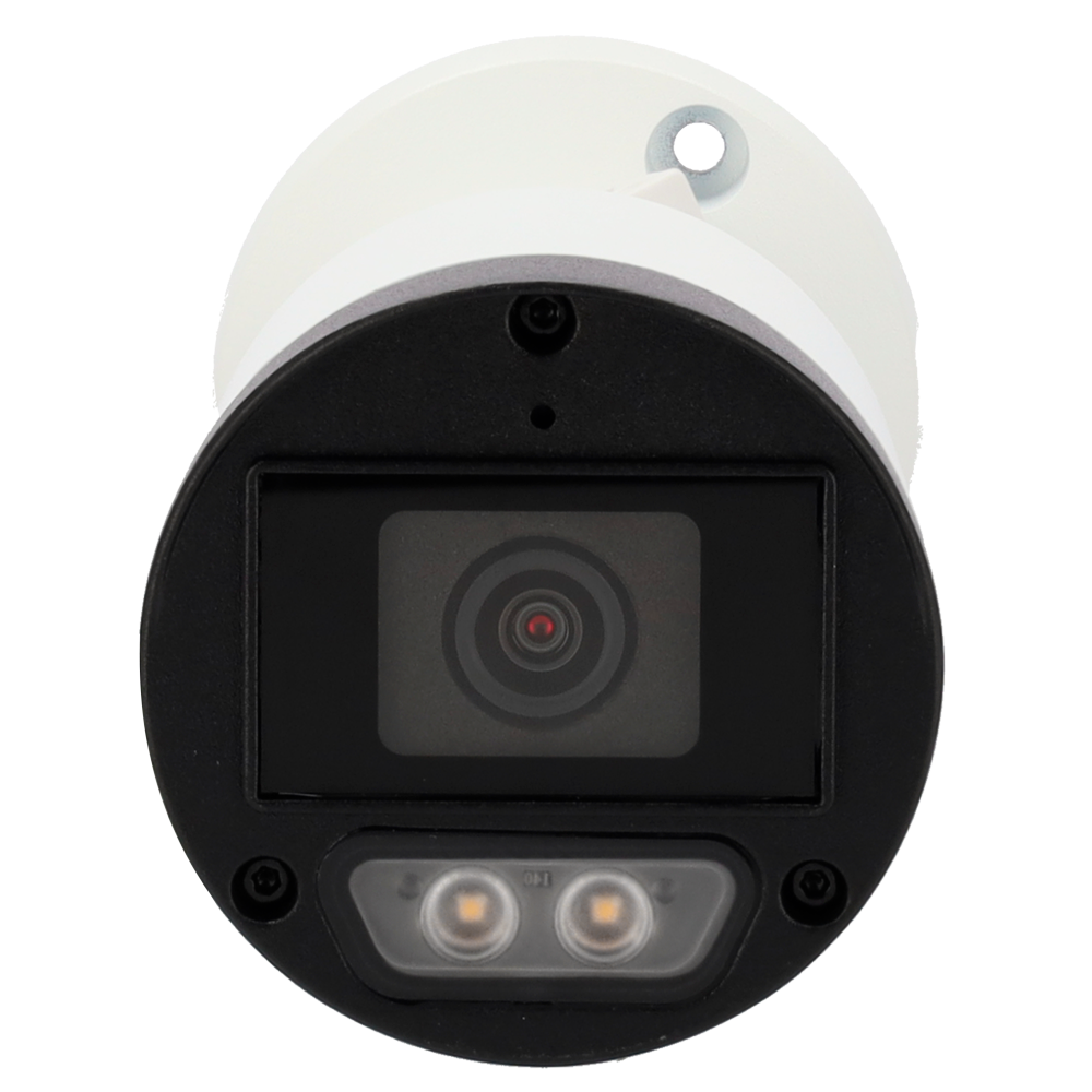 Cámara Bullet Análoga 4 en 1 de 2 MP con lente 2.8 mm. Equipada con la tecnología ColorHunter, garantiza imágenes a color incluso en condiciones de baja luminosidad. Tiene micrófono integrado para transmitir el audio sobre el cable coaxial. Sus dos iluminadores blancos le permiten una visión en total oscuridad hasta 40 m.