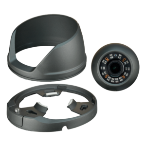 Carcasa fabricada en aluminio, resistente al agua según protocolo IP66, puede ser usada tanto para interior como para exterior. Dispone de tres ejes (3AXIS) que permiten un ajuste sencillo y exacto del ángulo de visión, con instalación en techo o pared. Incorpora un tornillo que une la base con la estructura de la cámara, para facilitar su instalación.