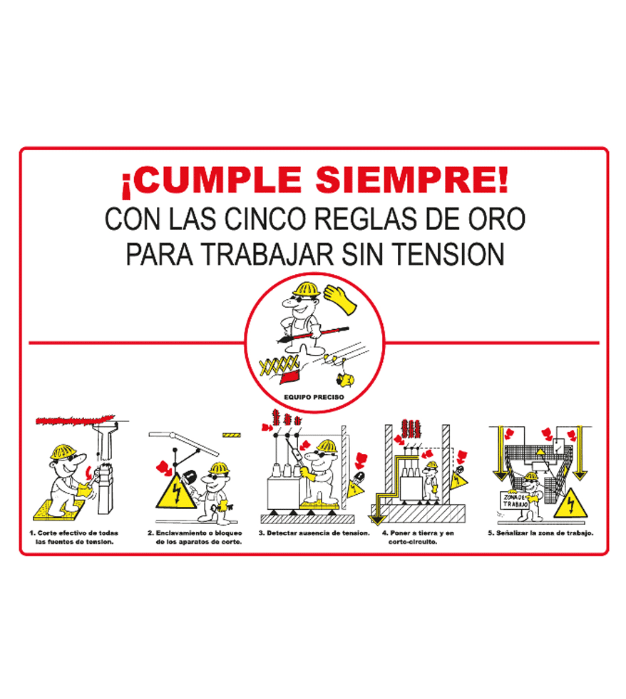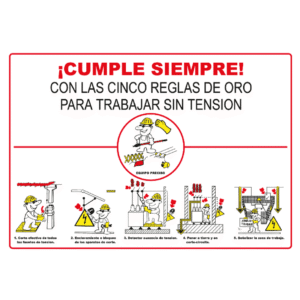 El cartel informativo de Las cinco reglas de oro para trabajar sin tensión está disponible en material PVC 0,7 mm y Aluminio 0,8 mm. También tiene varios tamaños a elegir para este mismo producto.