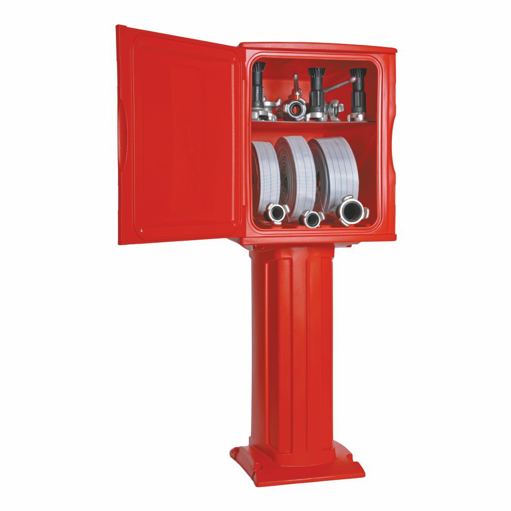 Caseta de intemperie para hidrante EACI CASE 02-R con dotación completa DOT-2 de mangueras de caucho ARMTEX certificadas. Fabricada en polietileno lineal de media densidad estabilizado UV, color rojo RAL-3000. Configuración vertical con cofre y columna soporte independientes. Cumple RIPCI RD 513/2017 y normativa UNE 23400/23091 para instalaciones de hidrantes contra incendios en edificios industriales, comerciales y logísticos.