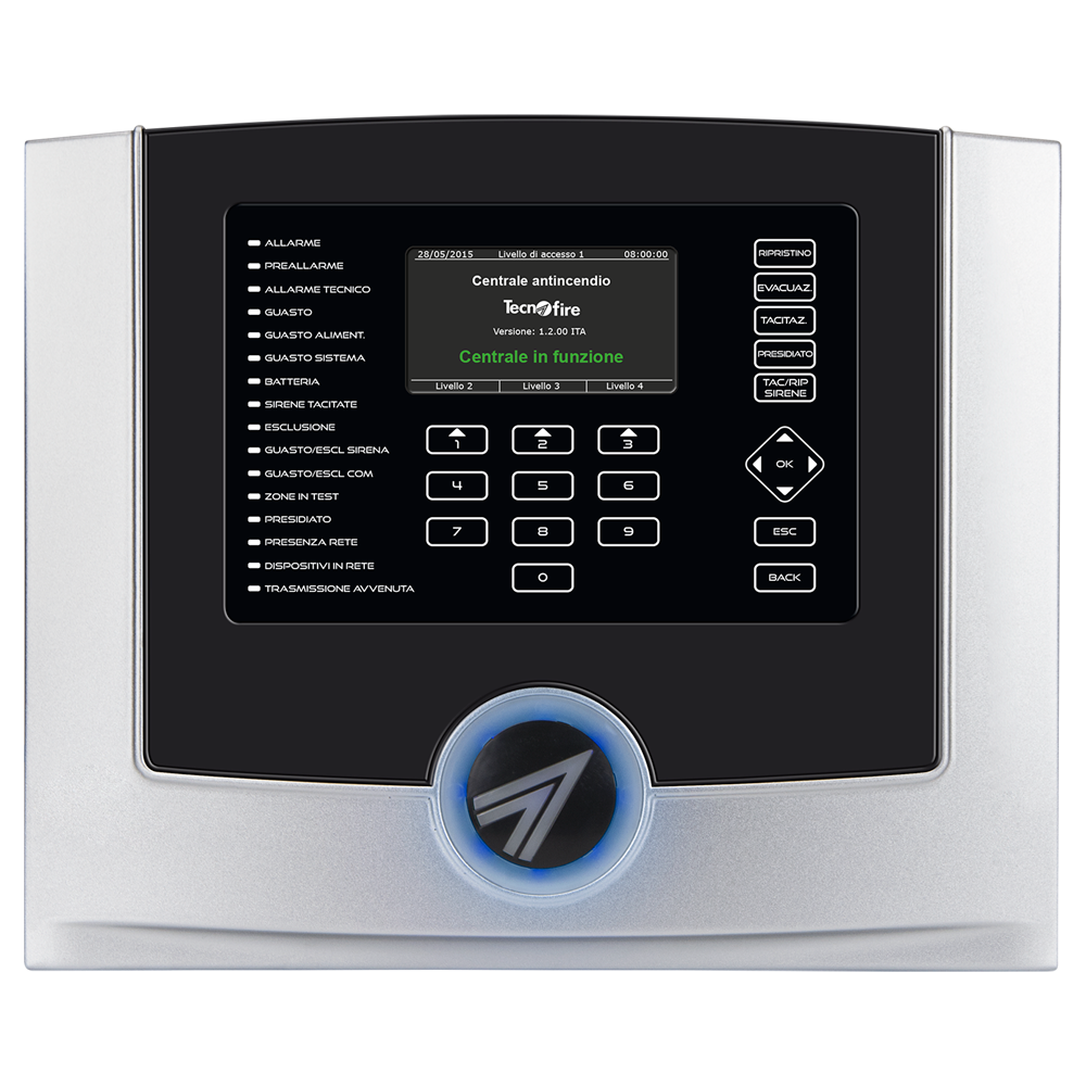 Interfaz de usuario: pantalla a color de 4,3”, teclado de programación y gestión, 16 Led de señalización, síntesis de voz y altavoz de señal acústica multifuncional, puerto USB, impresora serie.