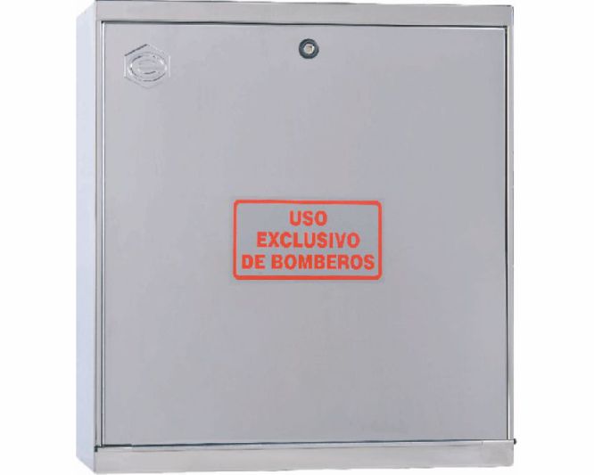 El cofre columna seca EACI C40PCI-C presenta unas dimensiones de 640 x 590 x 300 mm, optimizadas para su instalación en superficie en rellanos de escalera y zonas comunes. El acabado en acero inoxidable AISI 304 brillante garantiza máxima resistencia a la corrosión y durabilidad superior a 25 años en condiciones normales de uso. La puerta grafilada aporta un aspecto estético integrado con cualquier tipo de decoración interior, mientras que el cierre de cuadradillo permite el acceso rápido por parte de los servicios de bomberos. La válvula de esfera PN 30 soporta presiones de trabajo de hasta 30 bar, muy por encima de las exigencias habituales en columna seca. Los racores y tapones Barcelona certificados por AENOR según norma UNE 23400 garantizan la compatibilidad total con los equipos de los servicios de extinción de incendios.