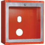 El cofre EACI C40PI-C presenta unas dimensiones de 640 x 590 x 300 mm (alto x ancho x fondo), optimizadas para su instalación en superficie en los rellanos de escalera o zonas comunes de edificios. El cuerpo de chapa de acero recibe un acabado en pintura de poliéster RAL 3000, el rojo normalizado para equipos contra incendios que facilita su identificación inmediata. La puerta en acero inoxidable AISI 430 con acabado grafilado aporta resistencia a la corrosión y un aspecto profesional que se integra en cualquier entorno arquitectónico. El sistema de cierre mediante bombín con figura de cuadradillo permite el acceso rápido por parte de los servicios de emergencia con la llave normalizada.