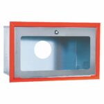 Las dimensiones del cajón de empotramiento son: Altura 330 mm, Ancho 576 mm y Fondo 297,5 mm, diseñadas para facilitar su instalación empotrada en paramentos verticales. El frontal presenta unas dimensiones de Altura 383 mm y Ancho 630 mm, proporcionando un acabado estético y profesional. El marco en pintura de poliéster RAL 3000 (rojo normalizado contra incendios) garantiza la identificación inmediata del equipo según normativa. La puerta de acero inoxidable AISI 430 grafilado ofrece máxima resistencia a la corrosión y un acabado antihuellas de alta durabilidad. El sistema de cierre mediante bombín con llave de cuadradillo es el estándar en instalaciones contra incendios, permitiendo el acceso rápido a los servicios de emergencia.