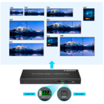 El HDMI-VW-9-4K destaca por su capacidad para adaptarse a múltiples configuraciones de pantallas mediante modos de división programables: 1×2, 1×3, 1×4, 2×2, 2×3, 3×2, 2×4, 4×2 y 3×3. Esta flexibilidad permite diseñar videowalls desde 2 hasta 9 monitores según las necesidades específicas de cada instalación. La configuración se realiza de forma sencilla mediante interruptores DIP integrados o comandos RS-232, permitiendo cambios rápidos sin necesidad de reconfigurar el cableado.