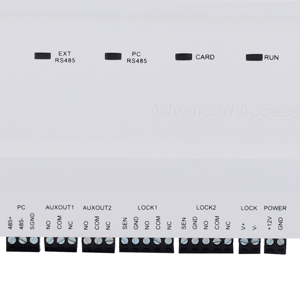 Las controladoras permiten gestionar varias puertas de manera simultánea mediante varias salidas de relé. Este modelo cuenta con 2 salidas de relé, siendo configurables como contacto seco (sin tensión) o contacto mojado (con tensión).