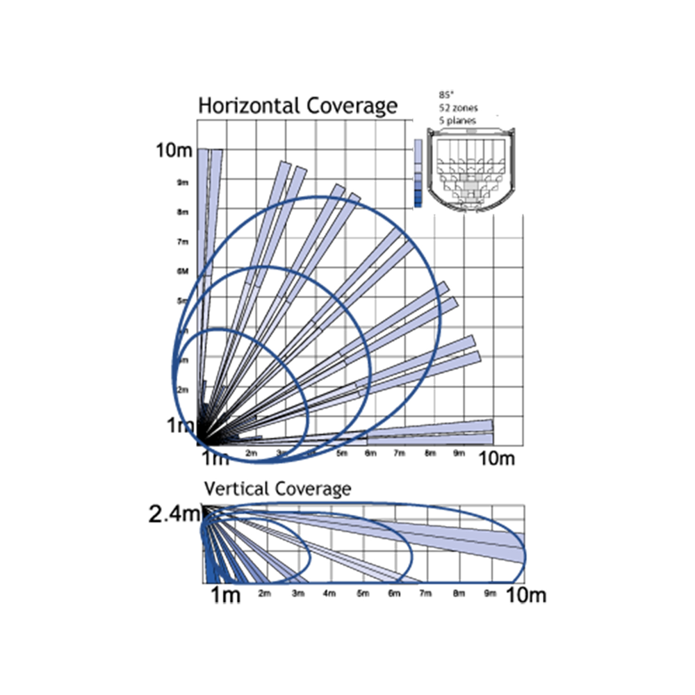 - Amplia cobertura gracias a su lente 3D (10 m en 85º para H = 2.4 m)