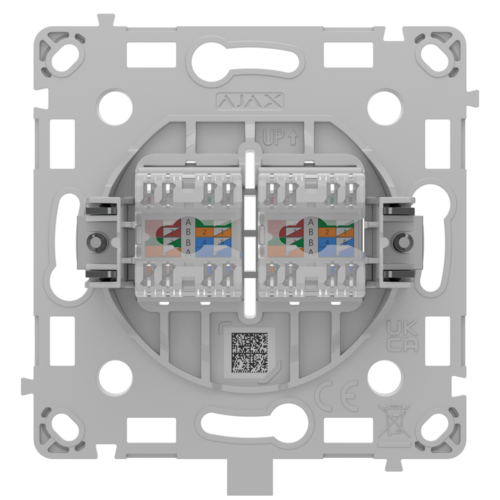 Ajax Outlet (LAN) es una base de enchufe Ethernet con dos puertos que admite una transferencia de datos de alta velocidad compatible con cables CAT.6 y CAT.5e, siendo una solución ideal para transmisiones de vídeo 4K y otras que requieran de un gran ancho de banda. Su instalación es rápida y sencilla ya que encaja en una caja de montaje estándar y no requiere cambios del cableado exsistente.