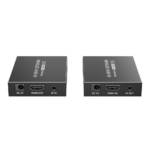 El extensor utiliza tecnología HDBaseT que convierte la señal HDMI en datos transmisibles por cableado estructurado de red. El conjunto incluye una unidad transmisora que se conecta a la fuente de vídeo (grabador DVR/NVR, ordenador de gestión, matriz HDMI) y una unidad receptora que alimenta el monitor o videoproyector de destino. Ambas unidades mantienen la compatibilidad con resoluciones hasta 3840×2160 píxeles a 30 fotogramas por segundo, suficiente para aplicaciones de videovigilancia profesional y presentación de contenidos.