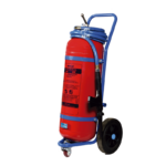 Extintor hídrico móvil de 50 litros con eficacia 34A, diseñado para protección contra fuegos de clase A en instalaciones industriales, almacenes y grandes superficies. Equipado con ruedas para fácil desplazamiento y manguera de descarga de largo alcance. Cumple con la normativa UNE-EN 1866 y RIPCI.
