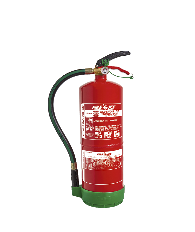 Extintor portátil de 6kg – POLVO EFICACIA MEDIA – 27A 183B Terminación: granallado y pintado con pintura 100% poliéster. Válvula: cuerpo de latón y pintura metalizada. M-30. Difusor: incluido. Indicador de presión: 23 mm, latón cromado. Soporte para vehículo: Incluido. Temperatura de trabajo: -30ºC a +60ºC. Tensión eléctrica hasta 50.000 V. Certificados: Certificado Aprobación Marcado CE Marca Calidad de Producto Fichas: Castellano Inglés Francés Portugués Alemán Rumano