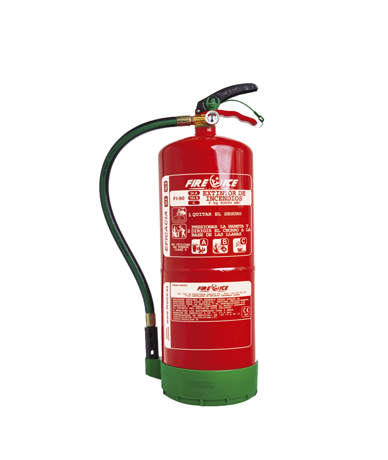 Extintor portátil de 9 kg POLVO“PURPLE K” Terminación: granallado y pintado con pintura 100% poliéster. Agente extintor: “PURPLE K”.Válvula: cuerpo de latón y pintura metalizada. M-30.Peana: Alta resistencia al impacto.Manguera-Difusor: Alta eἀcacia.Indicador de presión: 27mm, latón cromado.Soporte mural: Incluido.Temperatura de trabajo: -30°C a +60°C.Tensión eléctrica hasta 50.000 V. Certificados: Certificado Aprobación Marcado CE Marca Calidad de Producto Fichas: Fichas: Castellano Inglés Francés Portugués Alemán Rumano