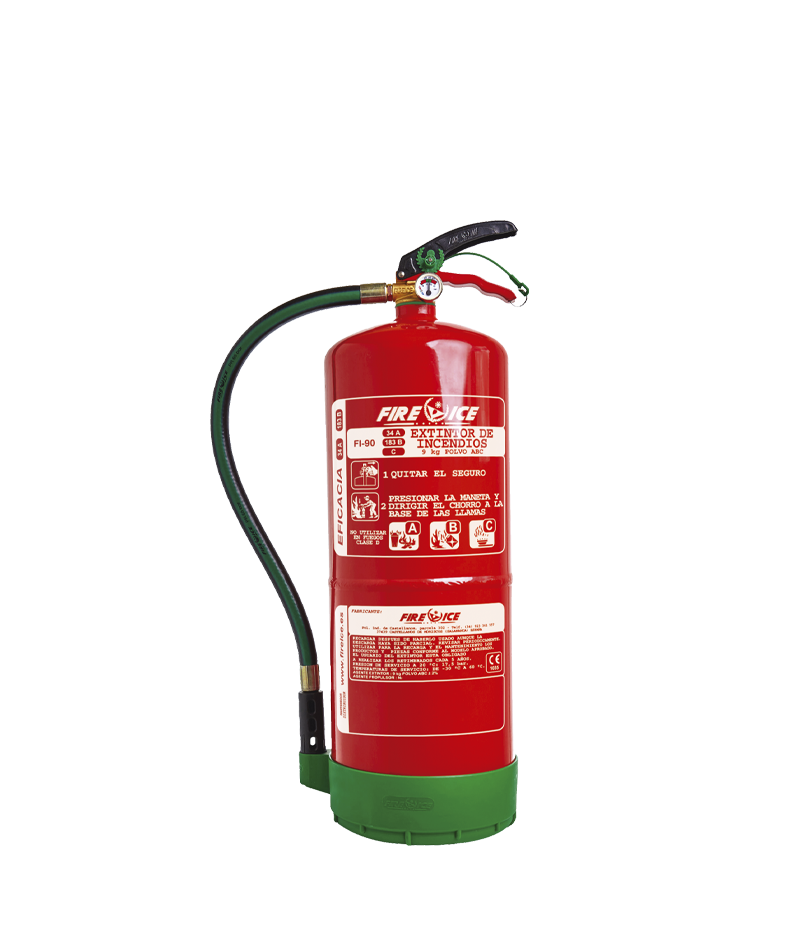 Extintor portátil de 9 kg – POLVO EFICACIA ALTA – 43A 233B Terminación: granallado y pintado con pintura 100% poliéster. Válvula: cuerpo de latón y pintura metalizada. M-30. Difusor: incluido. Indicador de presión: 23 mm, latón cromado. Soporte para vehículo: Incluido. Temperatura de trabajo: -30ºC a +60ºC. Tensión eléctrica hasta 50.000 V. Certificados: Certificado Aprobación Marcado CE Marca Calidad de Producto Fichas: Castellano Inglés Francés Portugués Alemán Rumano