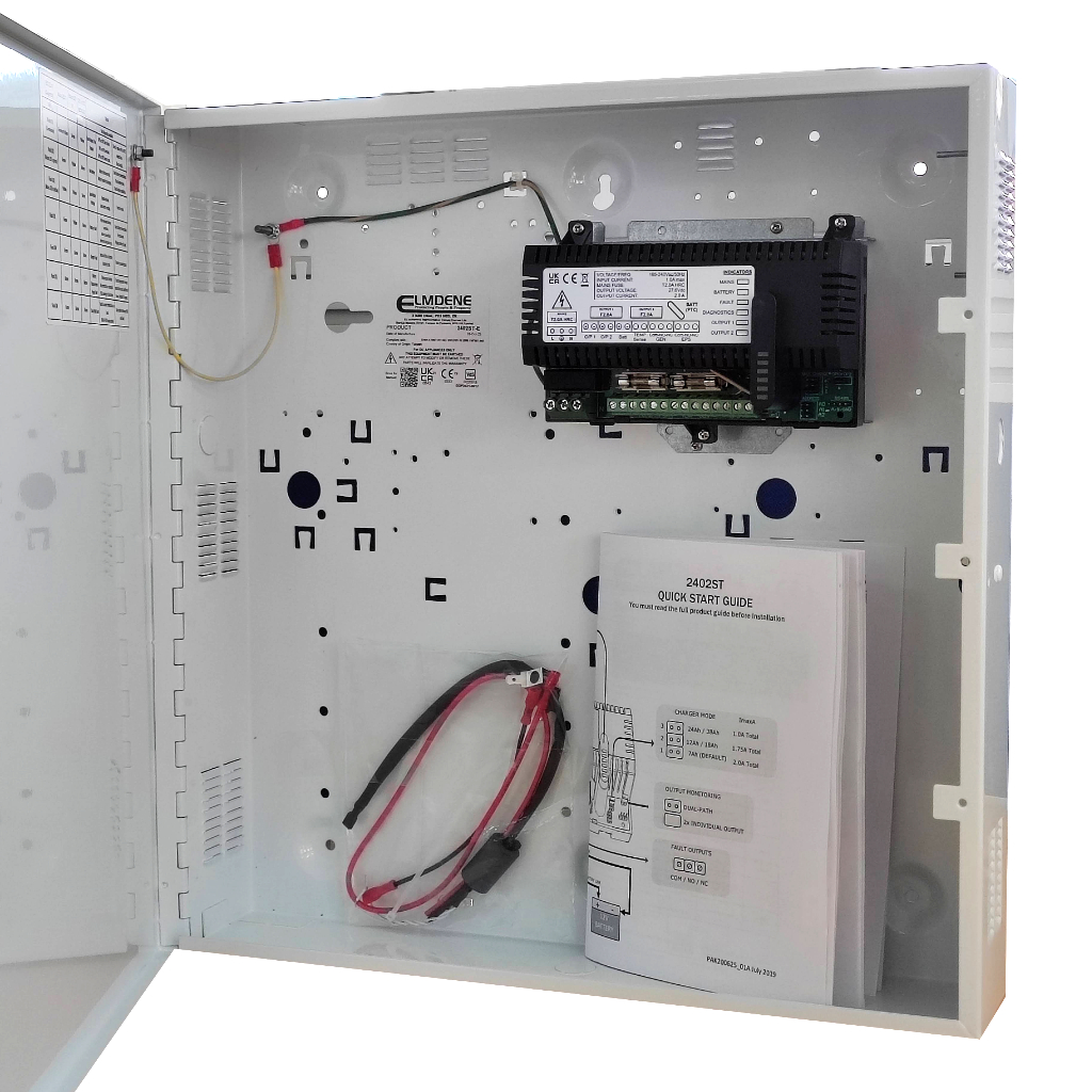 Fuente de alimentación ELMDENE 2402ST-E de 24V y 2A con batería integrada de 17Ah, certificada según norma EN54-4 para instalaciones de detección y alarma de incendios. Suministrada en caja metálica robusta, garantiza alimentación ininterrumpida para centrales y equipos auxiliares en sistemas de protección contra incendios.