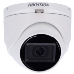 Cámara turret HIKVISION DS-2CE76H0T-ITMFS(3.6mm) de 5 megapíxeles con tecnología híbrida 4 en 1 (TVI/AHD/CVI/CVBS), micrófono incorporado y visión nocturna infrarroja hasta 30 metros. Diseño compacto con certificación IP67 para instalaciones en exterior, ideal para sistemas de videovigilancia profesional en comercios, naves industriales y perímetros de seguridad.